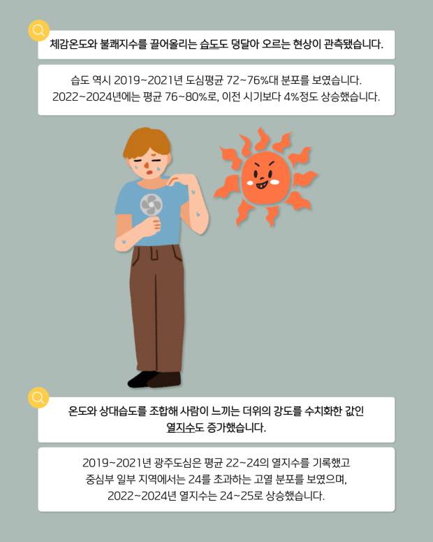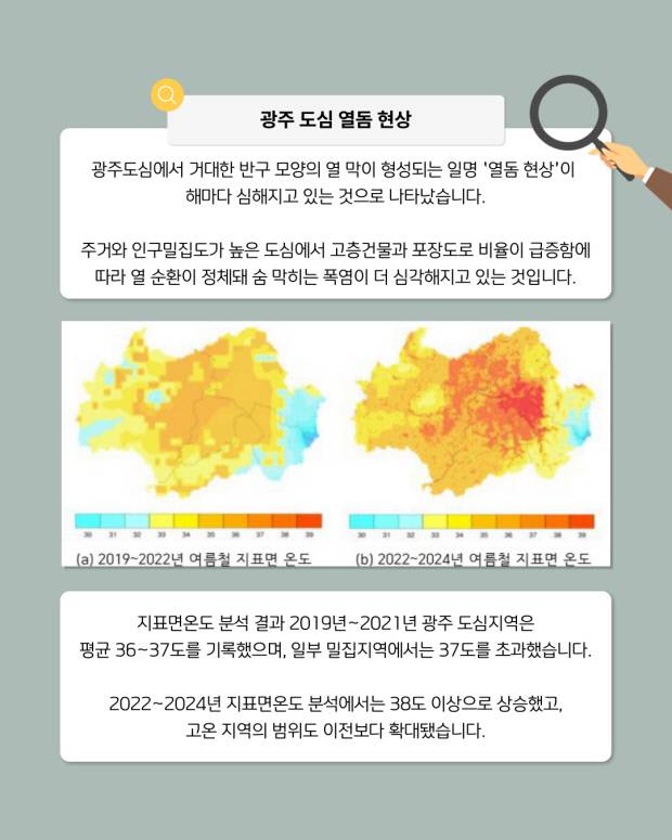 광주기후에너지진흥원(진흥원)의 지표면온도 분석 결과 2019년~2021년 광주 도심지역은 평균 36~37도를 기록했으며, 일부 밀집지역에서는 37도를 초과했습니다. 2022~2024년 지표면온도 분석에서는 38도 이상으로 상승했고, 고온 지역의 범위도 이전보다 확대됐습니다.