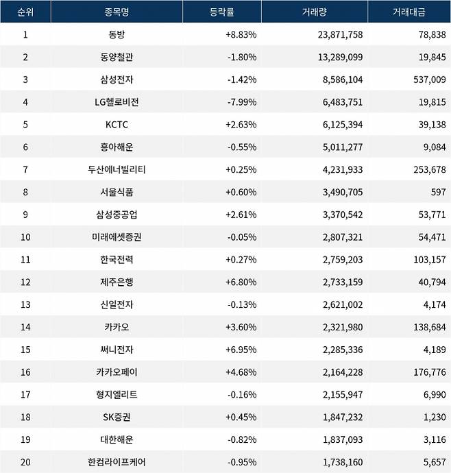 한편 거래량 상위 20위권 종목들은 한국전력(015760) ▲0.27%, 제주은행(006220) ▲6.80%, 신일전자(002700) ▼0.13%, 카카오(035720) ▲3.60%, 써니전자(004770) ▲6.95%, 카카오페이(377300) ▲4.68%, 형지엘리트(093240) ▼0.16%, SK증권(001510) ▲0.45%, 대한해운(005880) ▼0.82%, 한컴라이프케어(372910) ▼0.95% 등의 성적을 기록한다.