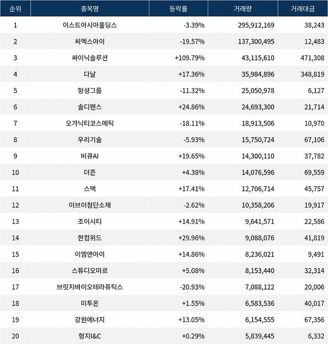 싸이닉솔루션(234030)은 4천3백만주 이상 거래되며 현재가 9,860원, 등락률 109.79%를 기록하여 거래량 3위를 차지하고 있다. 다날(064260)은 3천5백만주 이상 거래되며 현재가 9,940원, 등락률 17.36%를 기록하고 있다. 헝셩그룹(900270)은 2천5백만주 이상 거래되었으며 현재가 235원, 등락률 -11.32%를 나타내고 있다. 솔디펜스(215090)는 2천4백만주 이상 거래되며 현재가 909원, 등락률 24.86%를 기록하고 있다. 오가닉티코스메틱(900300), 우리기술(032820), 비큐AI(148780), 더즌(462860)도 각각 1천만주 이상의 거래량을 보이며 다양한 등락률을 기록하고 있다.