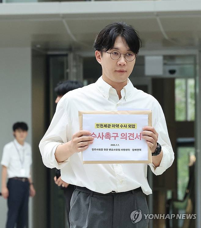 (서울=연합뉴스) 이진욱 기자 = 7일 민주사회를 위한 변호사 모임(민변)과 참여연대 소속회원이 김건희 여사 의혹을 수사 중인 민중기 특검팀 사무실인 서울 종로구 KT광화문빌딩 앞에서 세관 마약수사 외압 의혹에 대한 수사를 촉구하는 의견서제출을 위해 이동하고 있다. 2025.7.7