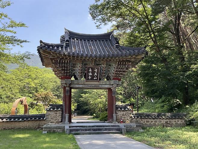 천은사 일주문은 다포식 지붕이 하늘로 새가 날아오르듯 날렵한 모양새였다. 기와지붕의 무게가 느껴지지 않게 산뜻하다. 이 일주문의 편액 '智異山 泉隱寺(지리산 천은사)' 글씨는 조선의 4대 명필에 꼽히는 이광사(1705~1777)의 작품이다. 지리산 천은사 여행은 이 일주문의 편액에 얽힌 설화에서부터 시작한다.