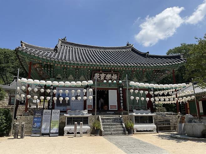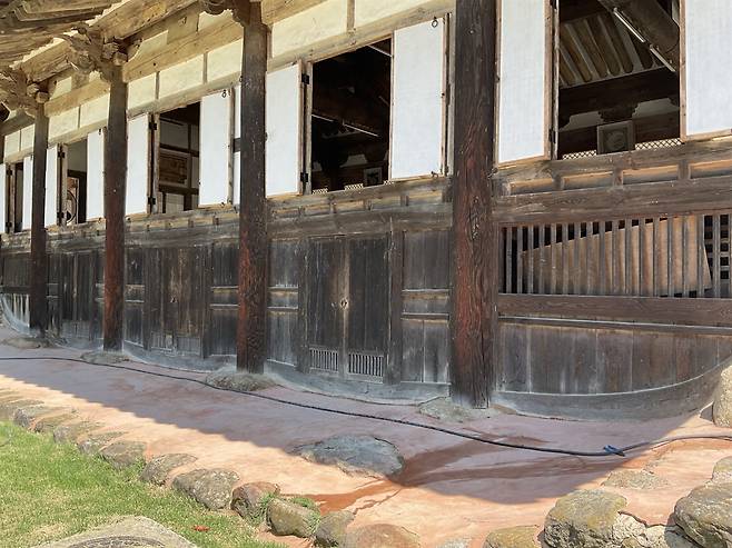 평지형이 아닌 비탈면 산기슭 비탈에 보제루가 얹혀있다. 아래쪽에서 올라가면서 보면 2층이다. 아래층은 헛간 창고 용도로 보이고, 2층은 강당이다. 그런데 절 마당에서 보면 1층이다. 자연과 조화를 이루는 건물의 순발력이 놀랍기만 하다.
