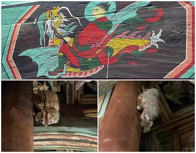 이어 응진전 안에서 독창적인 문양의 용 형상을 발견했다. 동자가 용을 타고 하늘을 날고 있다. 용의 날개가 물고기 지느러미 같다. 용이면서 하늘을 나는 배와 같고 물고기 이미지가 풍긴다. 17세기 말에 편찬된 남원의 향토 읍지인 용성지(龍城誌)에 감로사에 대한 기록이 있다.