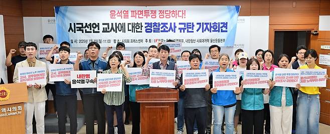 내란청산 사회대개혁 울산운동본부는 기자회견에서 "윤석열 파면 촉구한 교사는 피의자, 내란 옹호한 정치인은 조사조차 하지 않는 울산 경찰의 편파수사를 규탄한다"고 밝혔다.