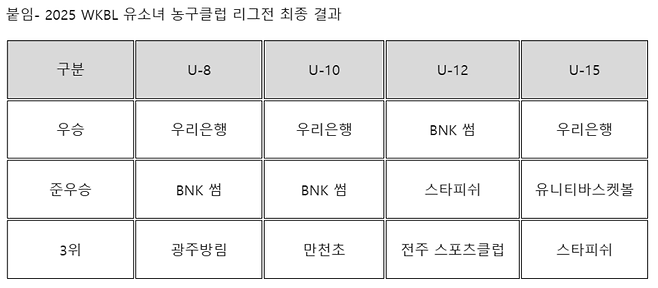 WKBL(한국여자농구연맹)은 6월 15일(일)부터 7월 6일(일)까지 총 3회에 걸쳐 경기도 안산에 위치한 신안산대학교 체육관에서 '2025 WKBL 유소녀 농구클럽 리그전' 일정을 모두 마무리했다.
