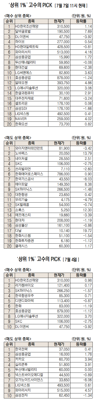 미래에셋증권은 자사 고객 중에서 지난 1개월간 수익률 상위 1% 투자자들의 매매 종목을 집계해 실시간·전일·최근 5일 기준으로 모바일트레이딩시스템(MTS)상에서 공개하고 있다. 이 통계 데이터는 미래에셋증권의 의견과 무관한 단순 정보 안내이며 각각의 투자자 개인에게 맞는 투자 또는 수익 달성을 보장하지 않는다. 또 테마주 관련종목은 이상 급등락 가능성이 있으므로 유의해야 한다.