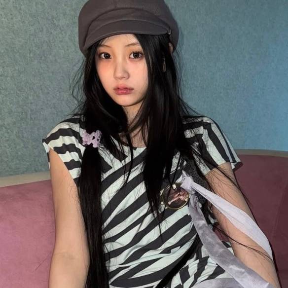 소녀스럽고 신선한 무드의 의상을 자주 입고 나오는 아일릿. 원희는 스트라이프 패턴의 드레스에 핑크 데님 팬츠를 매치하고 브라운 컬러의 베레모로 룩을 완성했다.