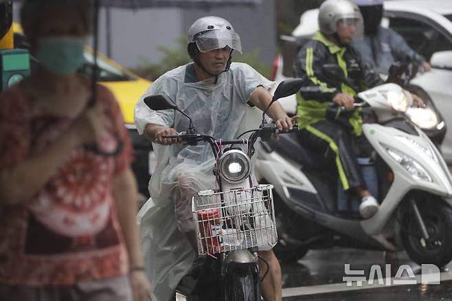 [타이베이=AP/뉴시스] 제4호 태풍 다나스가 7일(현지 시간) 대만을 통과하는 가운데 타이베이 시내에서 오토바이 운전자들이 빗속을 운행하고 있다. '다나스'는 대만의 산악 지대를 종단하면서 기세가 약화하고 중국으로 방향을 틀 것으로 예상된다. ‘다나스’는 필리핀에서 제출한 이름으로 ‘경험’을 뜻한다. 2025.07.07.