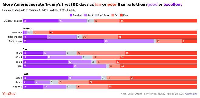 | ▲ 지난 4월 도널드 트럼프 미국 대통령 취임 100일을 맞아 <타임스>가 여론조사기관 유고브에 의뢰한 여론조사 결과 |