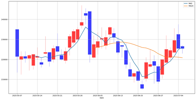 7월 4일 5일 이평선이 20일 이평선을 돌파하는 골든크로스 발생, 발생 후 전일 대비 종가 기준 25.55% 상승하며 9,730원에 마감하였음. 현재가는 1만1010원(오전 9시 15분 기준)으로 전일 종가 대비 13.16% 상승한 상태를 보임