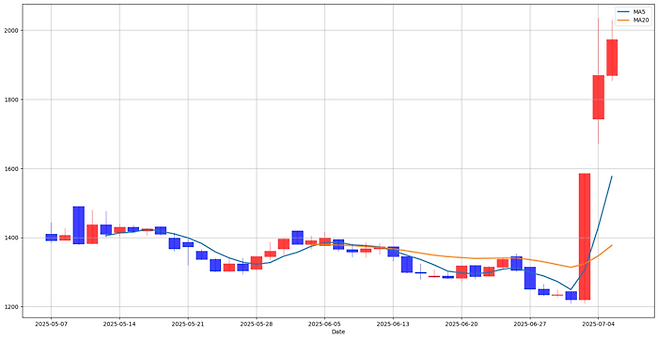7월 4일 5일 이평선이 20일 이평선을 돌파하는 골든크로스 발생, 발생 후 전일 대비 종가 기준 17.91% 상승하며 1870원에 마감하였음. 현재가는 1933원(오전 9시 15분 기준)으로 전일 종가 대비 3.37% 상승한 상태를 보임