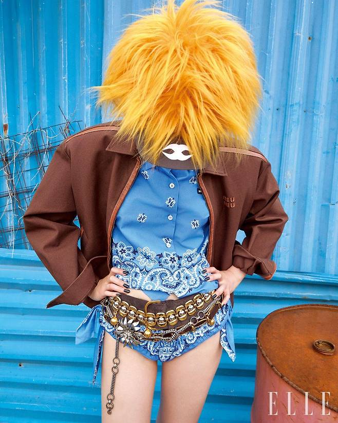 페이크 헤어를 장식한 캡은 23만6천원, Mosaic Society. 브라운 블루종 재킷과 블루 페이즐리 프린트 셔츠, 브리프와 이너 웨어로 착용한 스윔 브리프, 볼 디테일의 메탈 벨트와 플라워 모티프 체인 벨트는 가격 미정, 모두 Miu Miu. 레이어드한 와이드 스웨이드 벨트는 1백87만원, 골드 메탈을 더한 레더 벨트는 가격 미정, 모두 Valentino Garavani.