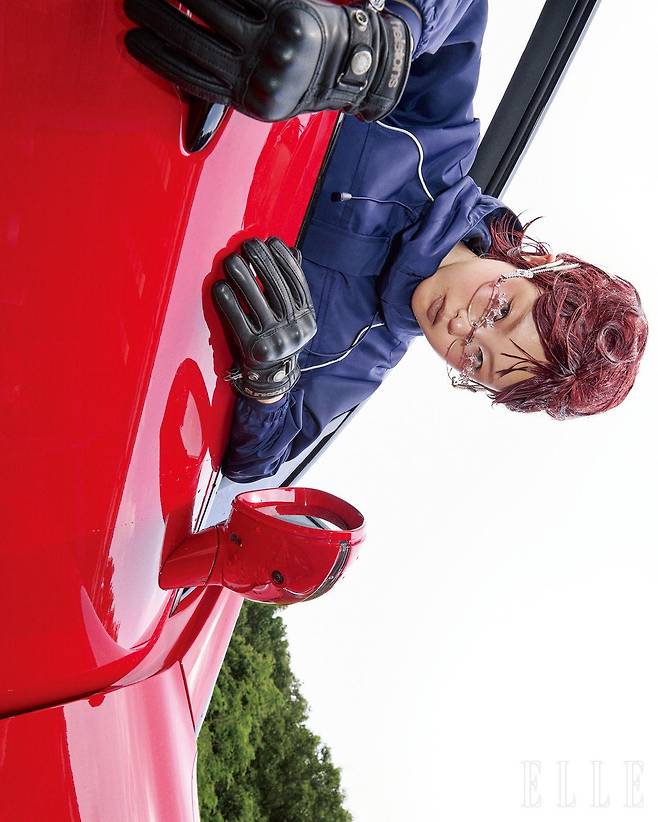 크리스털 아이웨어는 55만원, Gentle Monster. 나일론 윈드브레이커 재킷은 54만원대, Self-Portrait. 강렬한 레드 컬러의 포르쉐 카이엔 GTS는 가격 미정, Porsche.