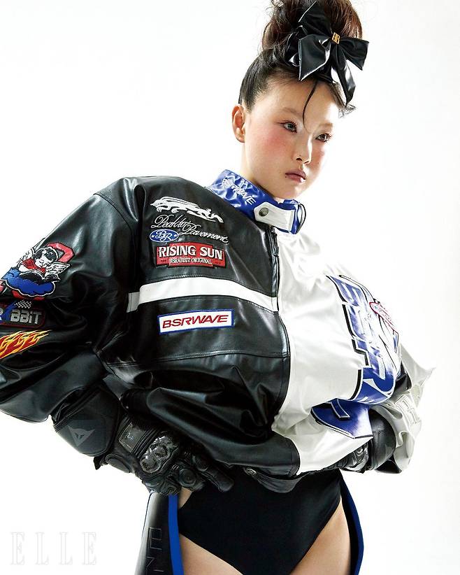 리본 디테일의 스크런치는 가격 미정, Balenciaga. 레더 레이싱 재킷은 34만8천원, Bsrabbit. 블랙 모노키니 스윔수트는 14만5천원, Yunsé. 블루 라이닝 디테일의 롱부츠는 가격 미정, Untitlab2Ⓡ.