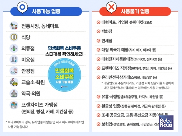 전통시장, 동네마트, 식당, 의류점, 미용실, 안경점, 교습소, 학원, 약국, 의원, 프랜차이즈 가맹점(편의점, 빵집, 카페, 치킨집 등) 등 연매출액 30억 원 이하 소상공인 업체에서 사용할 수 있다.