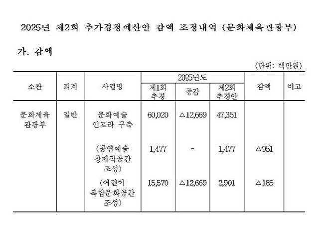 당초 문화체육관광부는 약 600억 원 규모의 문화예술 인프라 구축 항목 중 ‘공연예술창제작공간 조성 사업’에서 126억6900만 원 감액 편성하고,‘어린이복합문화공간 조성 사업’에서는 감액 편성 없이 국회에 제출했다.