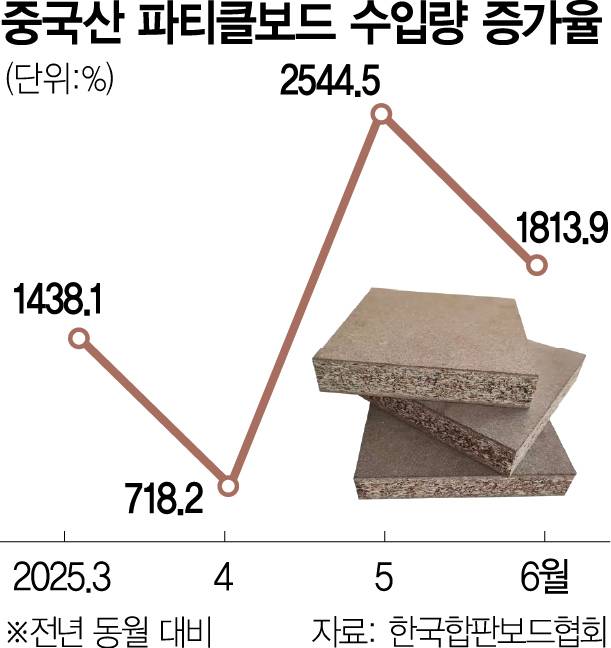 7일 산업계에 따르면 지난달 중국산 파티클보드(PB) 수입량은 총 2만 3407㎥로 전년 동월 대비 1813.9% 급증했다. 지난해 6월 전체 PB 수입량의 1.1%에 불과했던 중국산 PB 비중 역시 1년 만에 28.1%로 25배 이상 치솟았다.