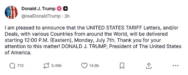 미국 도널드 트럼프 대통령은 6일 밤(현지시간) 소셜미디어 트루스소셜을 통해 "7일 월요일 정오(미 동부시간, 한국시간 기준 8일 새벽 1시)부터 전세계 여러 국가에 미국 관세 서한이나 합의 결과를 발송할 것을 발표하게 돼 기쁘다"고 밝혔다.