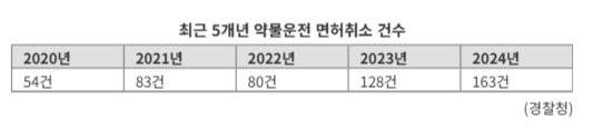 그러나 약물운전을 했다가 면허가 취소되는 사례는 해마다 증가하는 추세다. 본지가 경찰청에 요청해 받은 '최근 5년(2020~2024년) 운전면허 취소 처분 현황'에 따르면, 약물운전 면허 취소 건수는 2020년 54건에서 2021년 83건, 2022년 80건, 2023년 128건 등 매년 늘고 있다. 지난해는 2020년보다 약 3배 늘어난 163건으로 집계됐다. 약물 복용 운전자 상당수는 위법행위라는 사실을 인지하지 못하고 있다는 방증으로 해석된다.