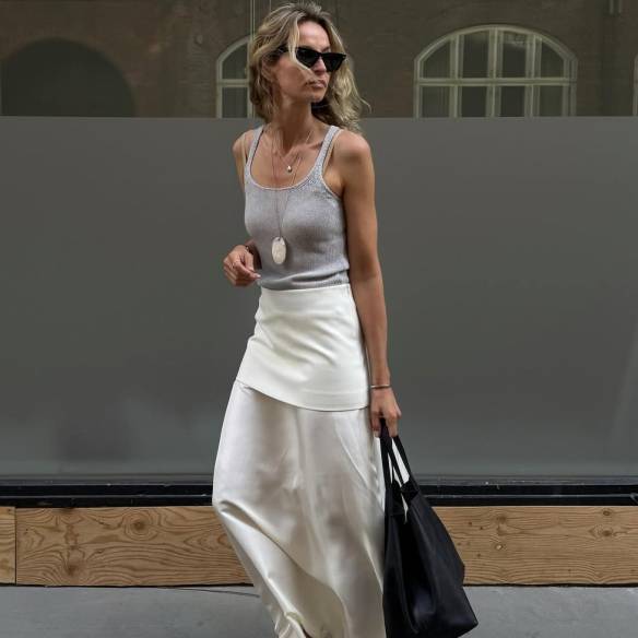 가장 기본적인 그레이 슬리브리스 하나만 준비해도 거의 모든 여름 스타일링을 해결할 수 있죠. 아눅 이브는 니트 톱에 광택 있는 실키한 롱스커트를 매치해 고급스럽고 유연한 실루엣을 완성했습니다. 플립플롭으로 힘을 빼면서도, 넉넉한 토트백으로 도회적인 감성을 놓치지 않았네요. 자칫 단조로울 수 있는 무채색 조합이지만, 오직 소재만으로 세련미를 완성했습니다.