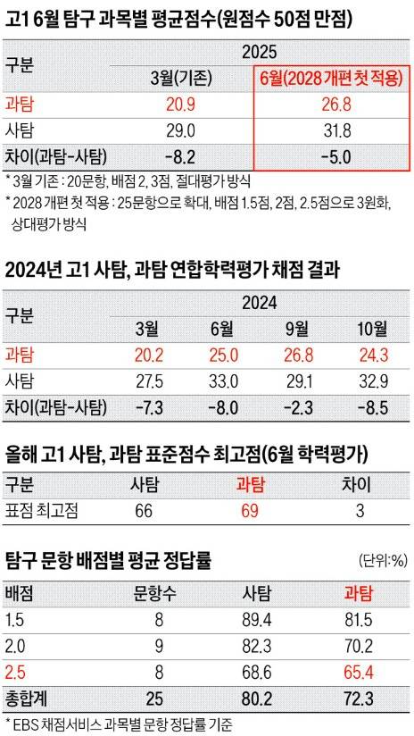 이번 고1 6월 학력평가는 2028학년도 수능 형태로 실시한 첫 모의고사였다. 특히 관심은 큰 변화를 겪은 탐구 과목으로 쏠렸다. 사회탐구(통합사회), 과학탐구(통합과학) 문항 수가 기존 20문항에서 25문항으로 늘고, 배점은 기존 2점, 3점 구성에서 1.5점, 2점, 2.5점 구성으로 바뀌었다. 평가 방식 또한 절대평가에서 상대평가로 변경되면서 새 수능 체제에 맞춰졌다.