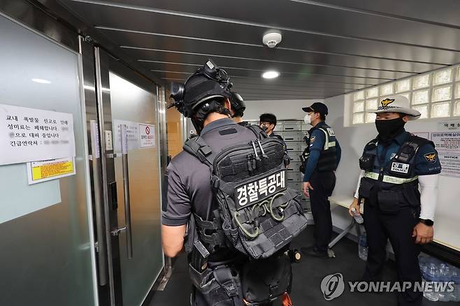 (서울=연합뉴스) 이진욱 기자 = 7일 서울 성북구 성신여대에 폭발물이 설치됐다는 의심 신고가 접수돼 경찰특공대 폭발물 처리반이 수색하고 있다. 2025.7.7