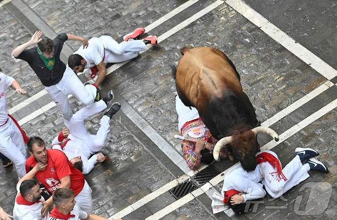 (팜플로나 AFP=뉴스1) 권영미 기자 = 7일(현지시간) 스페인 북부 팜플로나에서 열린 산 페르민 축제의 첫 행사 "엔시에로(황소와 함께 달리기)"에서 참가자들이 황소 옆에 넘어져 있다. 2025.07.07.