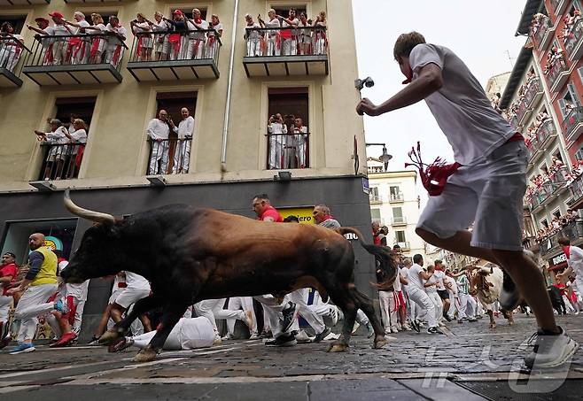 (팜플로나 AFP=뉴스1) 권영미 기자 = 7일(현지시간) 스페인 북부 팜플로나에서 열린 산 페르민 축제의 첫 번째 행사인 ‘엔시에로(황소와 달리기)’에서 참가자들이 황소와 함께 달리고 있다. 2025.07.07.