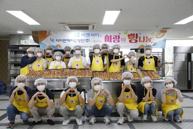 이날 봉사에 참여한 양 사 임직원과 부산항운노동조합 INK지부는 대한적십자사에 후원금과 함께 직접 만든, 정성이 가득한 빵(밤팥빵 등)을 장애인복지시설인 영광재활원 장애인 80명에게 전달했다.