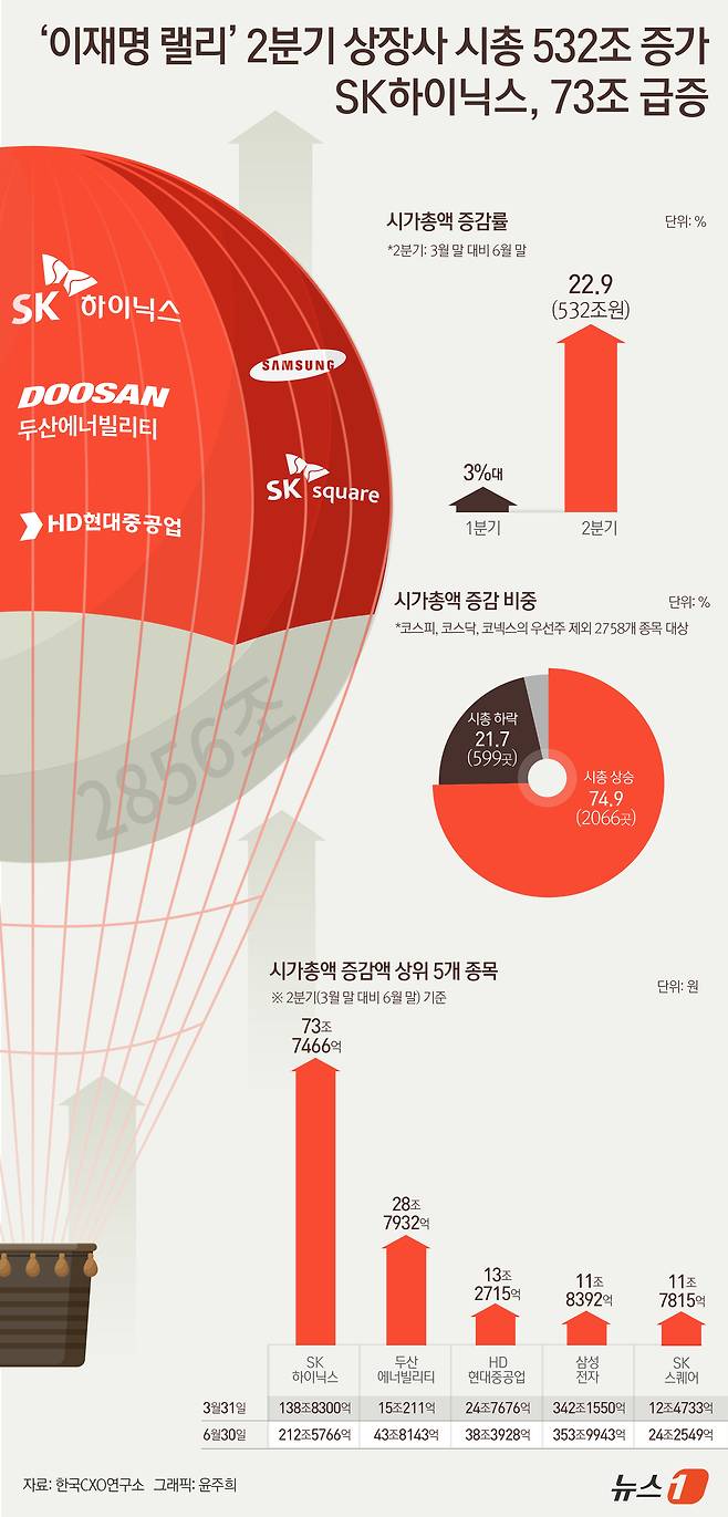 [오늘의 그래픽]'이재명 랠리' 2분기 상장사 시총 532조 증가…SK하이닉스, 73조 급증