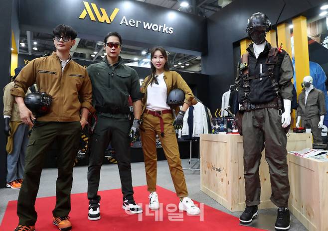 [이데일리 김태형 기자] 7일 경기도 일산 킨텍스에서 열린 '국제안전보건전시회'에서 모델들이 아레르웍스 신제품을 선보이고 있다.