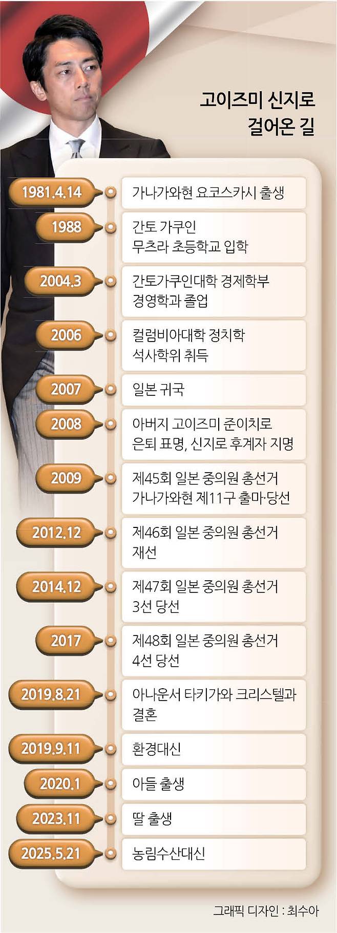 신지로는 증조부를 시작으로 4대째 이어진 세습 정치가로 총리 출신 부친의 후광으로 2009년 중의원(하원)에 처음 입성해 6선 의원으로 활발히 활동 중이다.