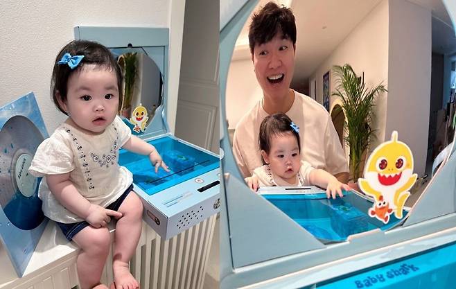 사진 속 재이 양은 파란 리본핀을 꽂고 아기상어 LP와 함께 탁자 위에 앉아 포즈를 취하고 있다. 재이 양의 리본핀과 깔맞춤을 한 듯한 LP와 장난감에 시선이 솔린다.
