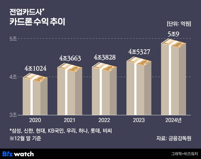 같은 기간 카드론 수익이 차지하는 비중은 24%에서 23%로 비슷한 수준을 유지했다. 카드론 수익은 2020년 4조1025억원 수준이었는데, 4년 만에 1조원가량 늘어나 지난해 처음으로 5조원을 넘어선 것으로 집계됐다.