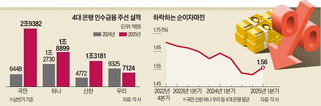 이들 은행이 인수금융 영업에 열을 올리는 것은 예전만큼 이자수익을 내기 어렵기 때문이다. 4대 은행의 올 1분기 순이자마진(NIM)은 평균 1.56%로 2022년 말(1.70%) 이후 내리막을 타고 있다. 금리 하락의 충격이 계속 반영되고 있다는 분석이 많다. 안정적 수익원이던 가계대출마저 정부의 규제 강화로 늘리기 쉽지 않다. 수도권의 주택담보대출 한도를 최대 6억원으로 제한하는 ‘수도권 가계부채 관리 강화 방안’이 지난달 말 시행되면서다.