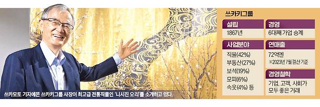 쓰카키는 150년이 넘는 역사 속에서 숱한 위기를 넘기며 살아남았다. 설립 이듬해 닥친 메이지유신을 비롯해 미국발(發) 대공황(1929년), 일본 패망(1945년), 동일본 대지진(2011년), 코로나19 사태(2020년) 등이 대표적 사건이다. 최근 교토 본사에서 만난 쓰카키그룹의 6대 경영인 쓰카모토 기자에몬 사장(77)은 “역사적 경험에서 교훈을 찾아 위기를 어떻게 기회로 바꾸는지가 중요하다”며 “오미 상인의 경영철학을 실천하는 것도 지속 가능성의 비결”이라고 강조했다.