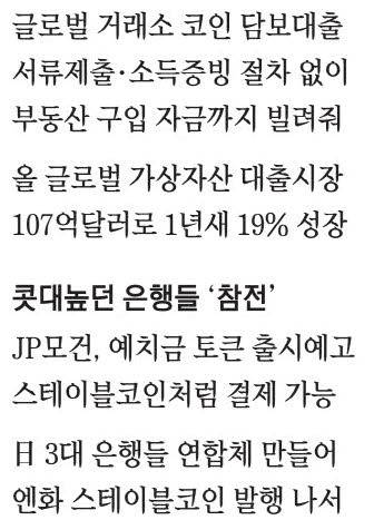 반대로 은행이 가상자산 관련 사업으로 눈을 돌리는 경우도 증가하고 있다. 대표적으로 JP모건은 최근 '예치금 토큰'인 JPMD 출시를 준비하고 있다. JPMD는 24시간 결제 기능을 갖고 있고 보유자에게 이자를 지급한다. 스테이블코인과 유사하지만 JP모건 기관 고객들에게만 제공되고 기존 예금을 가상자산으로 옮긴 만큼 스테이블코인과 차별된다는 설명이다. JP모건은 JPMD가 기존 은행 시스템과 연결을 유지하면서도 자금을 더 빠르고 쉽게 이동시키는 수단이 될 것으로 기대하고 있다. 뱅크오브아메리카(BoA)도 연초부터 스테이블코인 출시 준비를 하고 있다고 밝혀 왔다. 단 금융당국과 협의해 규제 관련 문제가 없다는 확신이 들 때 본격적으로 진출한다는 방침이다. 모건스탠리는 직접 스테이블코인을 출시하는 데엔 관심이 없지만 가상자산 관련 거래에 있어 중간 역할을 할 수 있는 방안을 구상 중이라고 밝힌 바 있다.