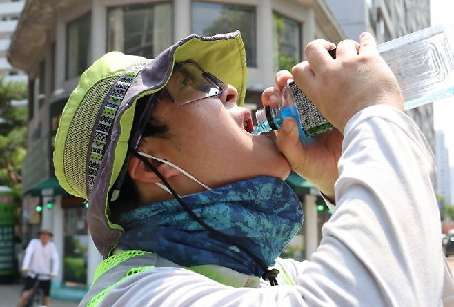 [7일 오전 대구 북구 침산동 일대에서 환경공무직 김건이(33)씨가 잠시 청소를 멈추고 이온 음료를 마시고 있다. 대구기상청에 따르면 이날 오후 2시를 기준으로 대구는 최고기온 37.3도를 기록했다.(사진=연합뉴스)]