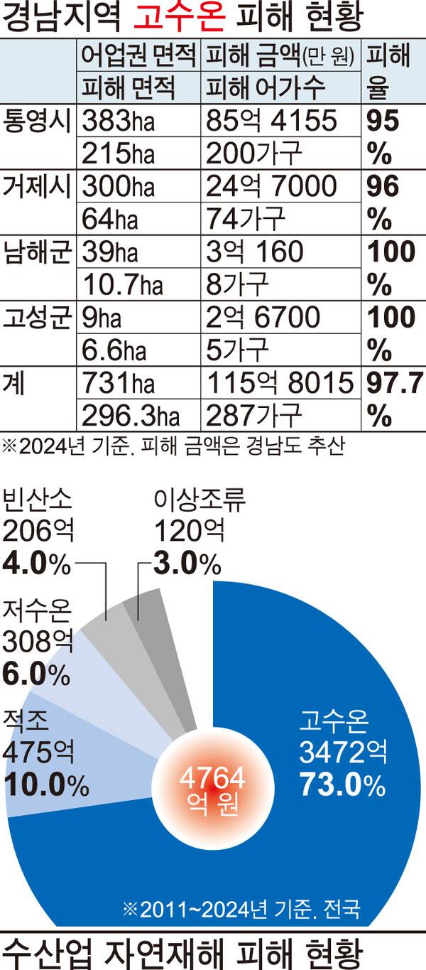 ◇고수온 피해 심각 = 수산업 종사자에게 고수온 피해는 이제 '상수'가 됐다. 2011년부터 2024년까지 집계된 자연재해 피해액을 보면, 고수온 피해가 3427억 원으로 전체의 73%를 차지한다. 지난해에는 연평균 수온이 평년보다 2도 이상 높았고, 고수온 피해액만 1430억 원에 달해 전체 수산재해 피해액(1504억 원)의 95.1%를 차지했다.