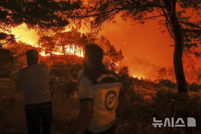 [라타키아=AP/뉴시스] 7일 새벽(현지 시간) 시리아 라타키아 외곽 라비아 인근에서 산불이 발생해 시리아 민방위대 '화이트 헬멧' 소속 소방구조대가 진화 작업을 벌이고 있다. 2025.07.07.