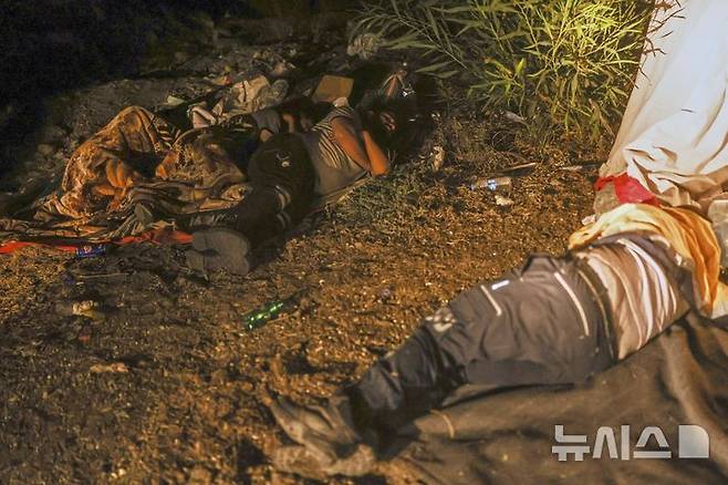 [라타키아=AP/뉴시스] 7일 새벽(현지 시간) 시리아 라타키아 외곽 라비아 인근 산불 현장에서 진화 작업을 하던 시리아 민방위대 '화이트 헬멧' 소속 대원들이 잠시 휴식하고 있다. 2025.07.07.