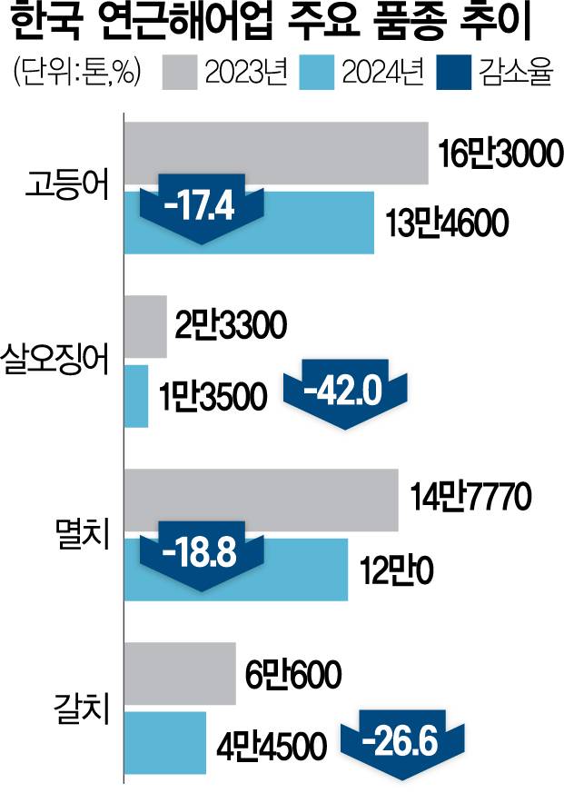 부경대 자원환경경제연구소는 최근 ‘기후변화가 한국의 수산업 생산에 미치는 영향’ 보고서를 통해 한국 연안 해역의 해수면 온도 상승이 전 세계 평균보다 2배 이상 빠르다고 밝혔다. 급격한 기후변화로 인해 한국 해역의 어업 생산 변화는 빠른 속도로 진행되고 있다. 1986년 172만 5800톤이었던 한국의 연안 및 근해 수산 생산량은 2018년 101만 1500톤으로 감소했고 2023년에는 100만 톤 아래로 떨어진 95만 1700톤에 그쳤다.