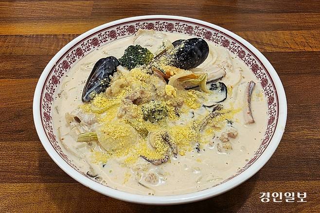 안산시 중앙역 로데오거리에 위치한 ‘팔도반점’의 시그니처 메뉴가 바로 크림짬뽕이다. 마치 까르보나라를 짬뽕 그릇에 담아낸 듯한 비주얼이다. 홍합·오징어·새우 등 각종 해산물과 우삼겹인지 차돌박이인지 헷갈리는 얇게 썰린 고기, 양파와 브로콜리 등의 채소가 면과 함께 뒤섞여 있다. 그 위에 치즈 가루까지 토핑으로 뿌려져 나온다.