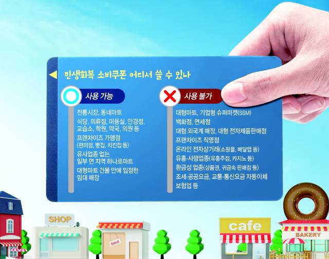 하나로마트는 도시지역에선 안 되고, 슈퍼가 별로 없는 일부 면지역에서는 쓸 수 있다. 편의점은 소상공인이 운영하고 있기 때문에 당연히 된다. 아울러 유흥·사행업종은 적용이 안 된다.