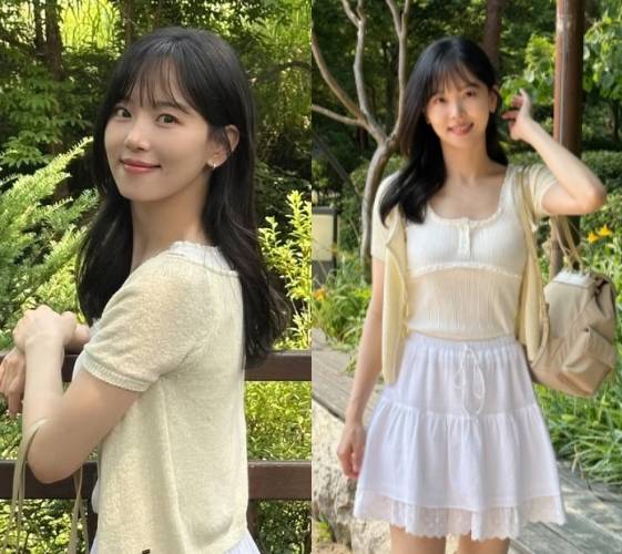공개된 사진 속 강한나는 숲길과 카페 등을 배경으로 산뜻한 아이보리 컬러의 여름룩을 완성해 눈길을 끌었다. 그는 잔잔한 주름 디테일이 돋보이는 슬리브리스 톱에 크롭 길이의 아이보리 니트 가디건을 걸쳐 청순하면서도 발랄한 분위기를 연출했다.