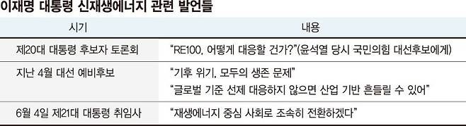 신재생에너지 전환은 이 대통령이 취임 전 후보 시절부터 꾸준히 강조한 주제다. 이 대통령은 지난달 4일 서울 여의도 국회에서 취임식에서도 "재생에너지 중심 사회로 조속히 전환하겠다"며 "에너지 수입 대체, RE100(사용 전력 100% 재생에너지로 충당) 대비 등 기업 경쟁력 강화에 더해 촘촘한 에너지 고속도로 건설로 전국 어디서나 재생에너지를 생산할 수 있게 해 소멸 위기 지방을 살리겠다"고 했다.