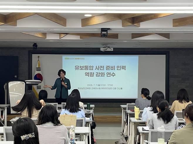 경상남도교육청(교육감 박종훈)이 7일 에듀테크센터에서 유보통합 사전 준비 인력을 대상으로 정책 이해 및 역량 강화 연수를 실시했다.