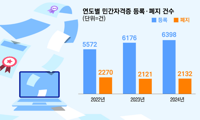 7일 한국직업능력연구원이 운영하는 민간자격정보서비스에 따르면 올해 상반기에만 3919개 종목의 민간자격이 신규 등록되며 우리나라 전체 민간자격증은 5만9171개에 달하는 것으로 집계됐다. 정부는 2008년부터 우수한 민간자격을 활성화하고 소비자 피해를 최소화하기 위해 민간자격등록제를 시행해 왔는데, 추세대로라면 연내 민간자격증 6만개 돌파가 유력하다.