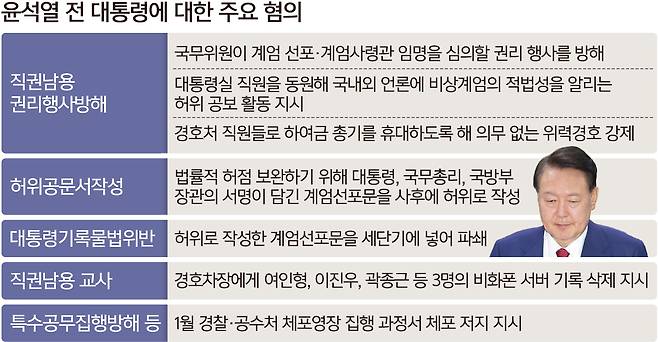 윤 전 대통령에 대한 체포영장이 발부된 뒤 경호처가 조직적으로 체포 저지에 나선 정황도 청구서에 담겼다. 윤 전 대통령은 박 전 처장 등과의 식사 자리에서 “공수처(고위공직자범죄수사처)는 내란죄 수사권이 없기 때문에 체포영장은 불법이므로 이에 응할 수 없다”고 하는 등 체포 저지를 지시했다.