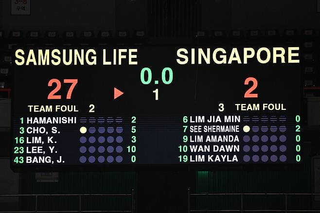 종료 2분 45초 전 싱가포르가 작전타임을 가져갔을 때 삼성생명이 86-19로 크게 앞서 있었다.